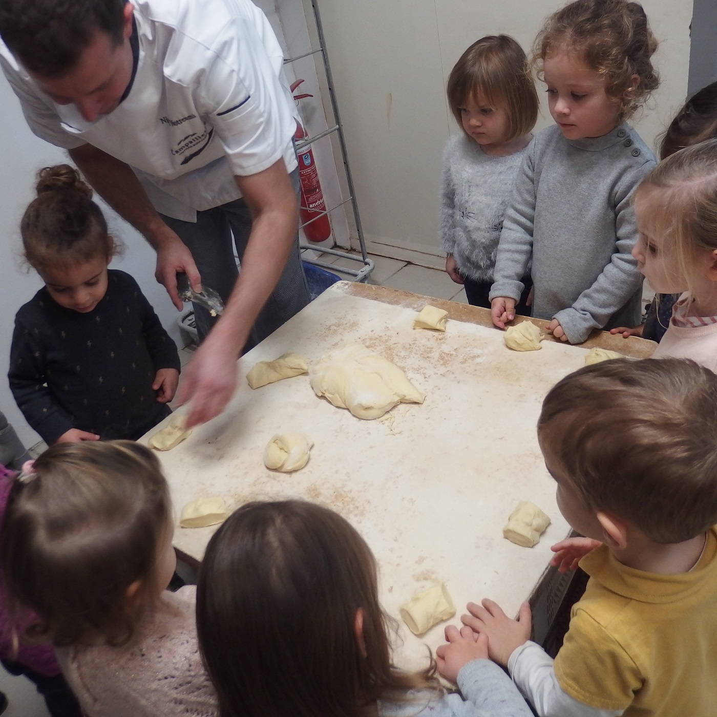 Dans le cadre de notre projet sur les métiers en maternelle, nous avons visité cette semaine la boulangerie Notreami. Nicolas, le pâtissier, et Maxime, le boulanger, nous ont fait découvrir leur métier à travers les différentes étapes de la confection du pain et la joie d’apprendre par nous-mêmes la réalisation de délicieuses brioches ! Merci beaucoup à la famille Notreami pour son accueil !