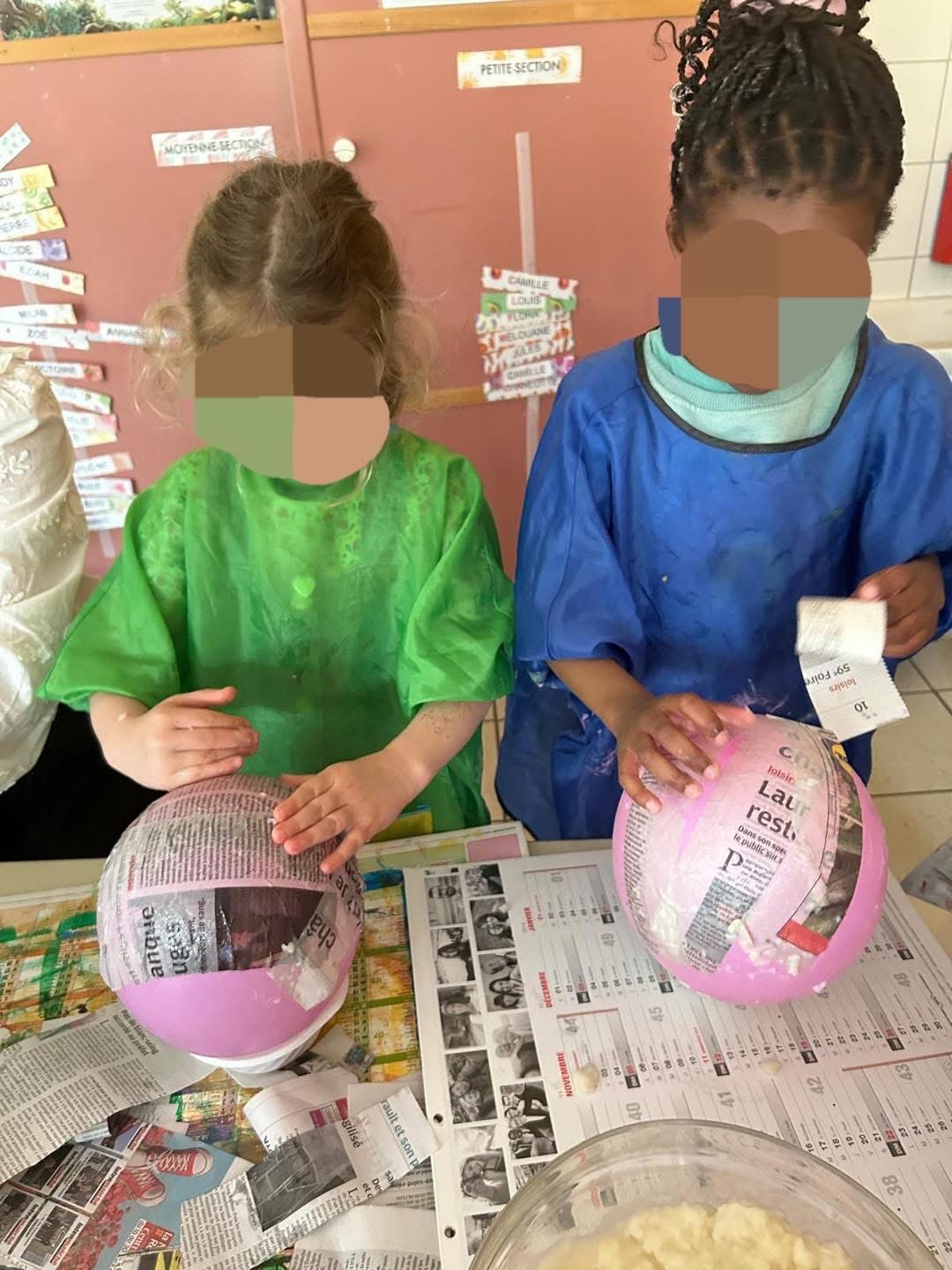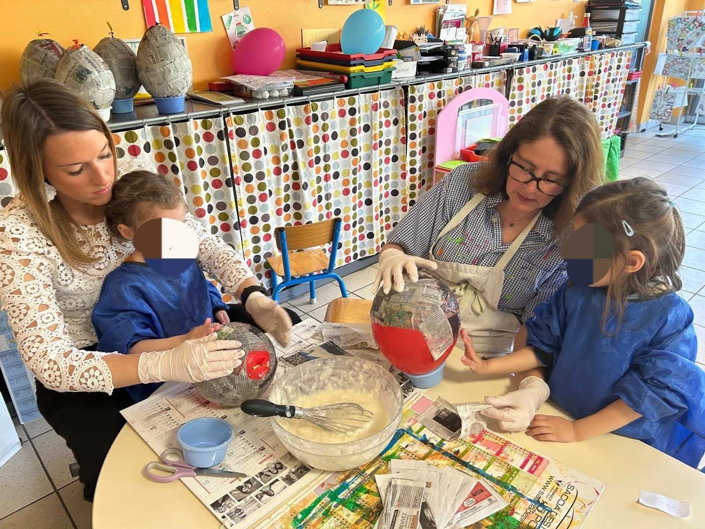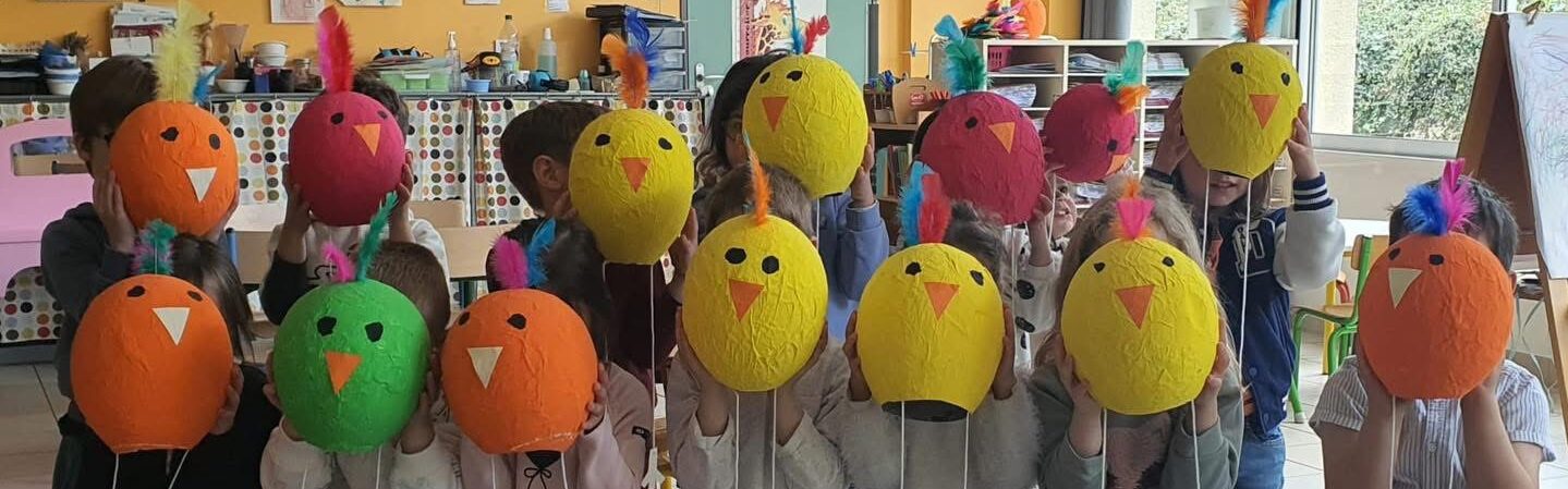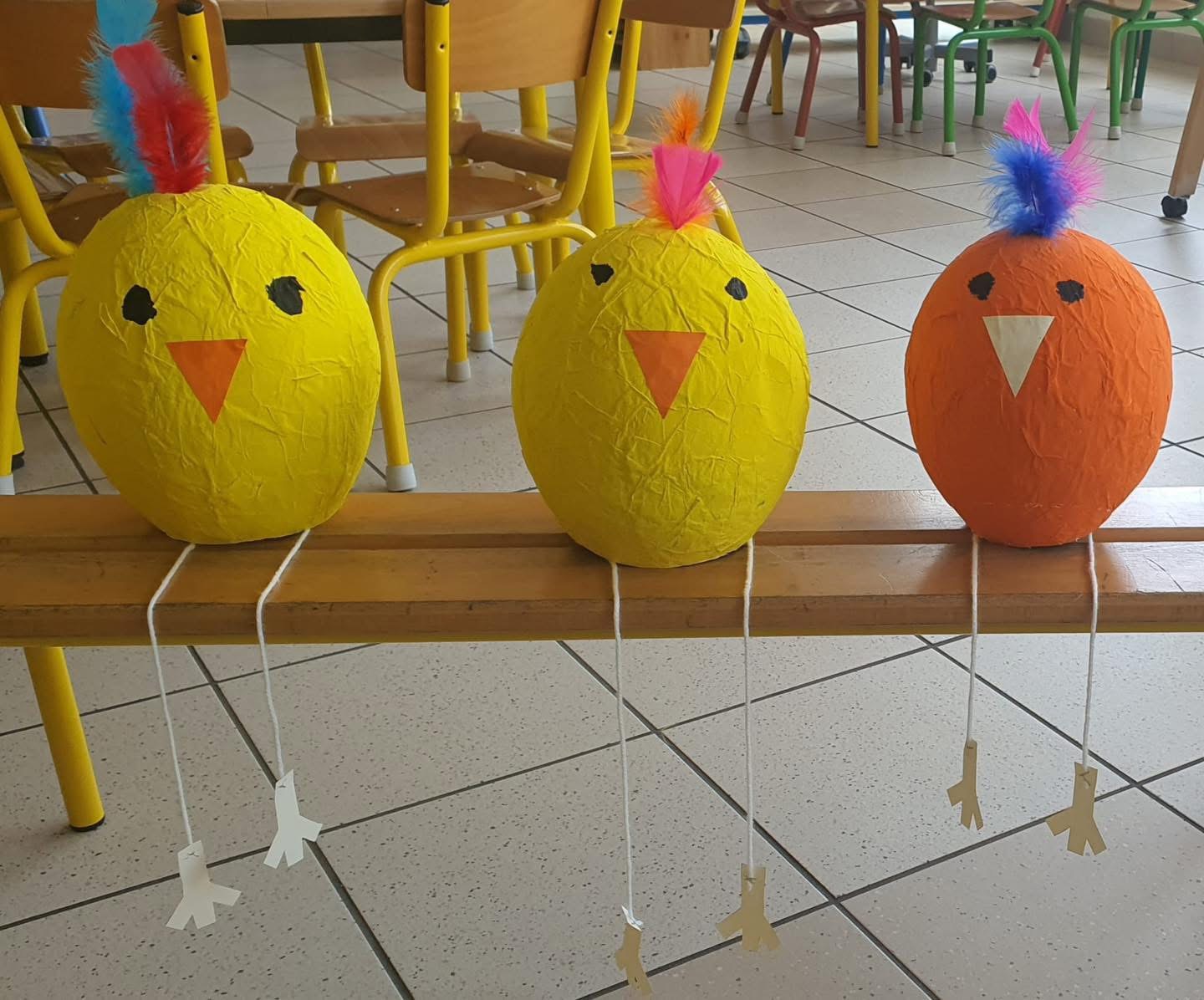 Nos élèves de la classe de Petite et Moyenne Section ont mis la main à la pâte (et au papier mâché !) pour faire naître ces adorables poussins colorés. Heureusement, ceux-là ne laissent pas de plumes et se contentent d’égayer nos murs.