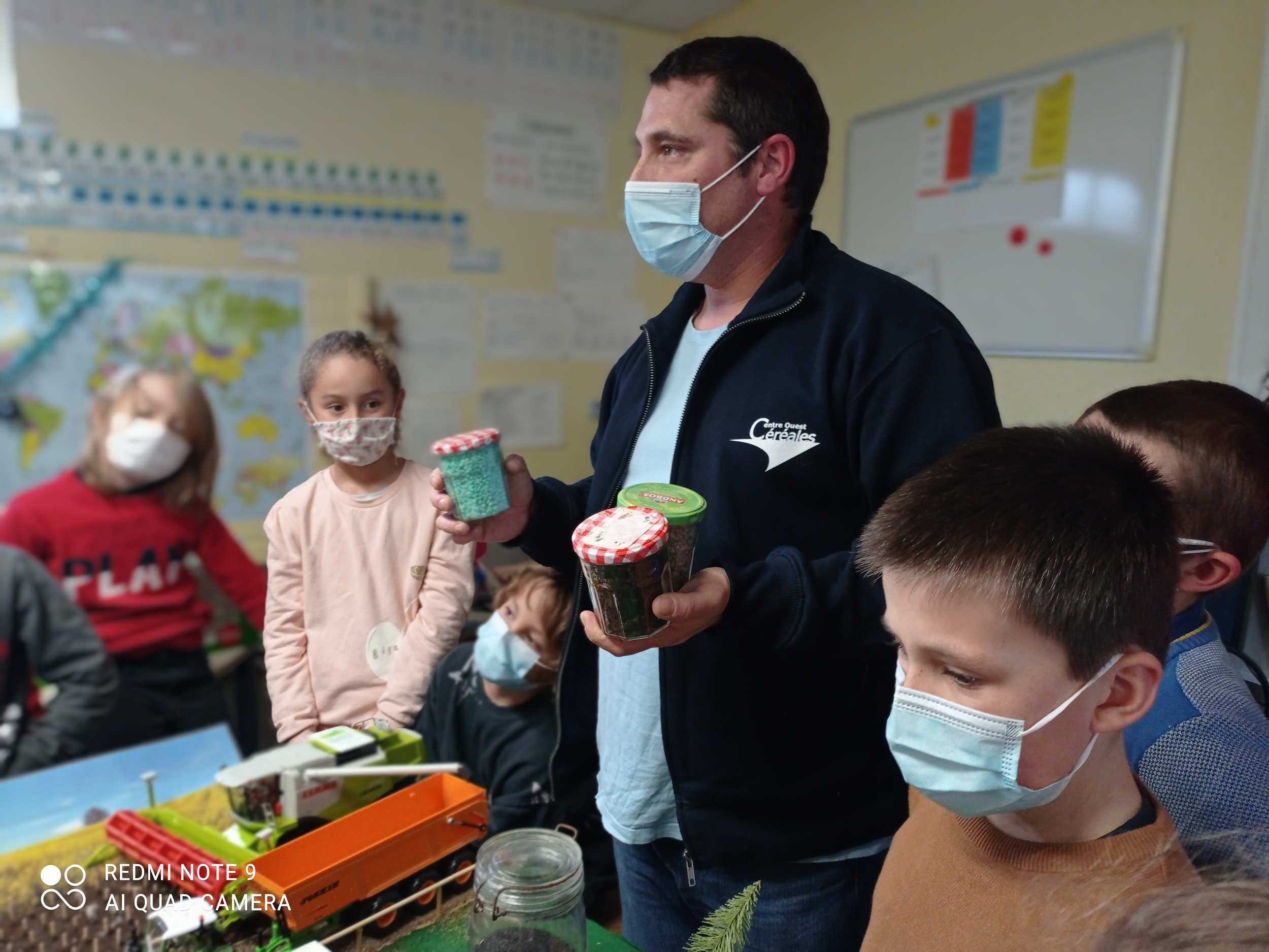 Fin décembre, Monsieur Auzannet, papa d’élèves est venu en classe nous faire découvrir ce qu’est un silo et les différentes céréales que les agriculteurs  font pousser dans les champs autour de chez nous. Il avait réalisé une maquette pour “La ferme s’invite” à Poitiers en novembre dernier.