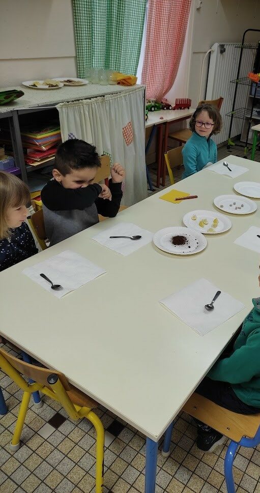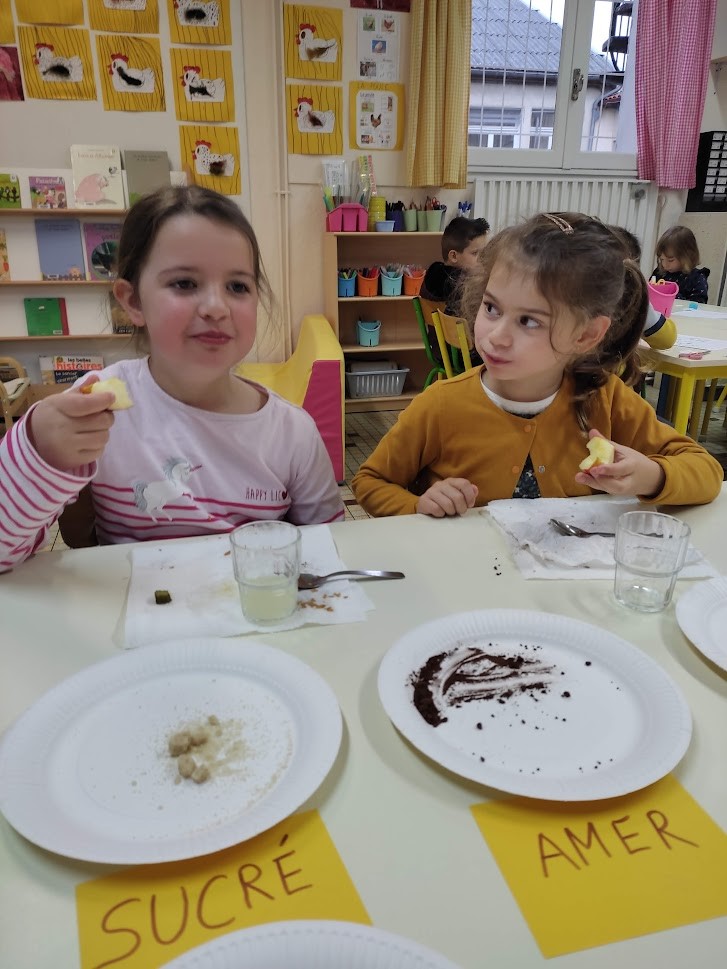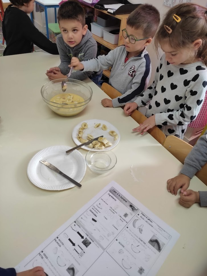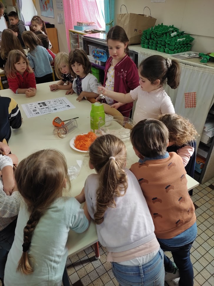 Pendant la semaine du goût, la classe des MS-GS a travaillé sur les différentes saveurs : le sucré, le salé, l’acide et l’amer. Nous avons également cuisiné un gâteau à la carotte et un gâteau à la banane. Contre toute attente, le gâteau à la carotte a été le plus apprécié par les petits comme par les grands !