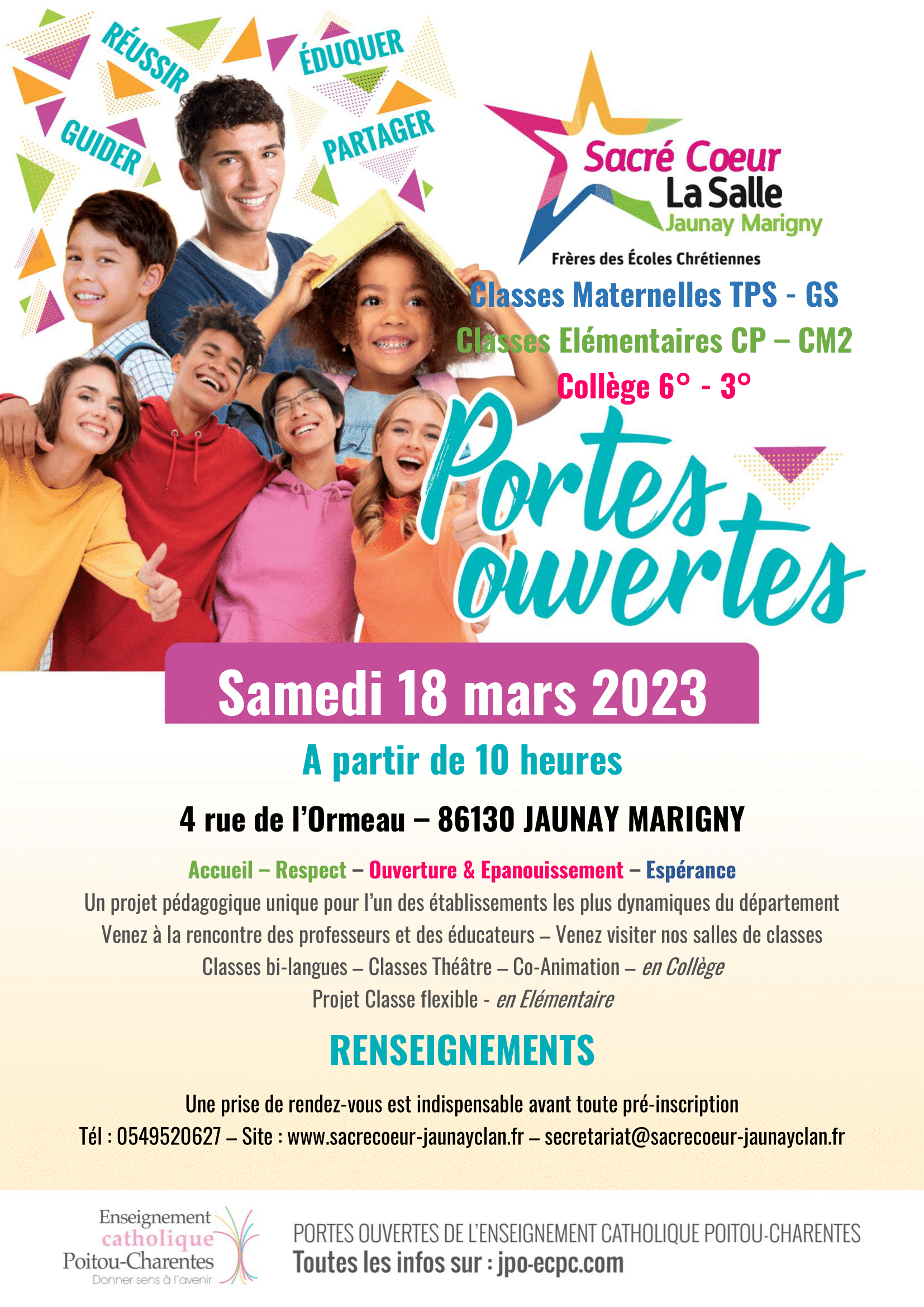 Nous serons ravis de vous accueillir pour la visite de l’école et la visite du collège, le SAMEDI 18 MARS 2023, à partir de 10h.