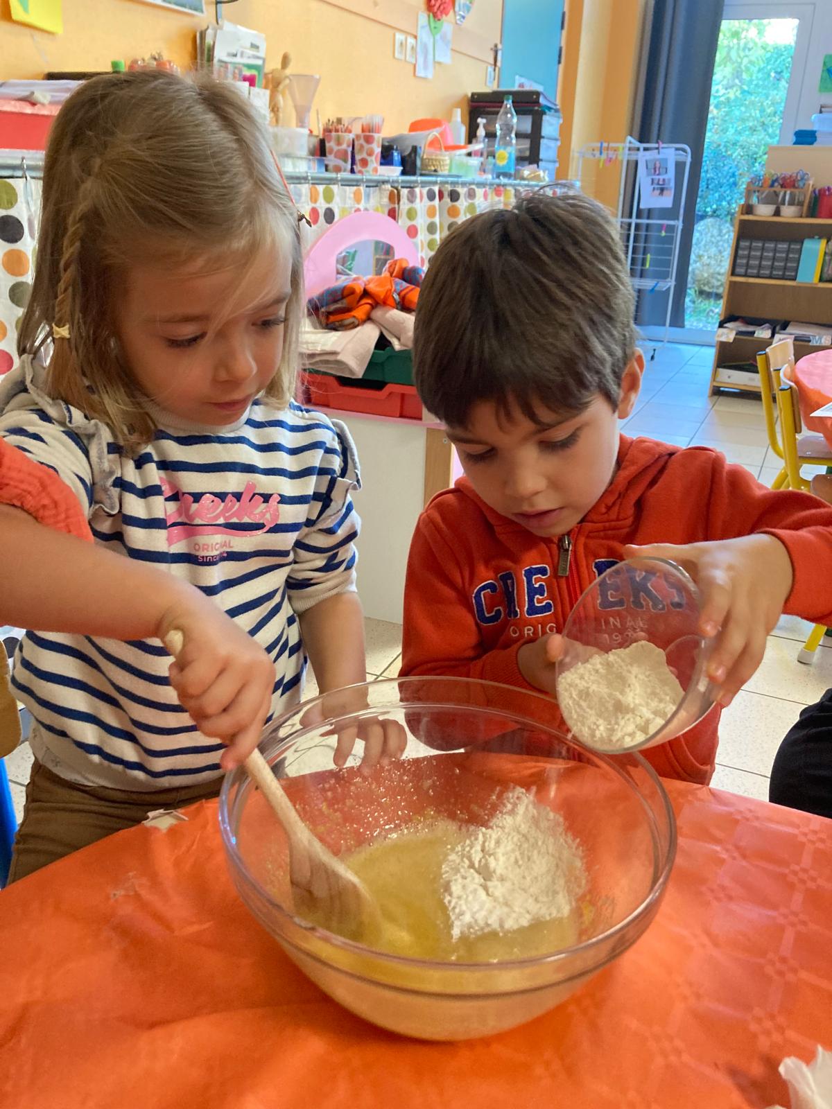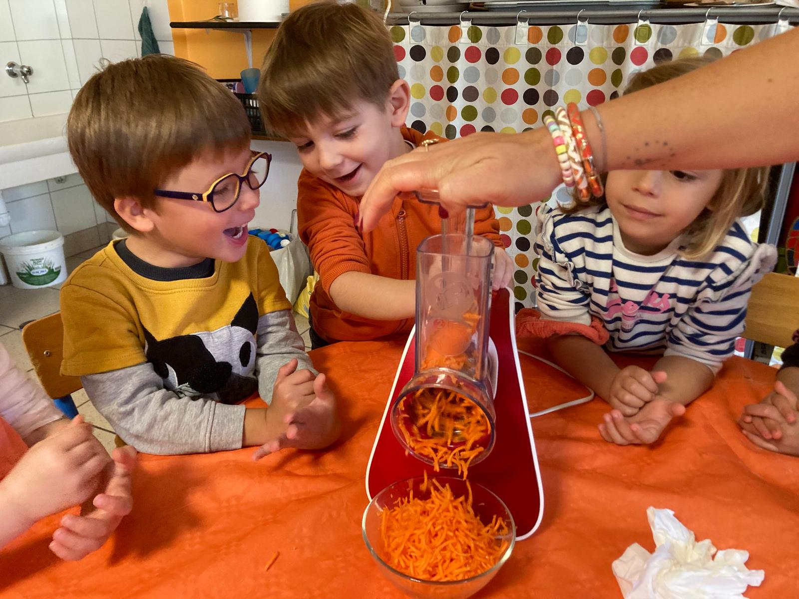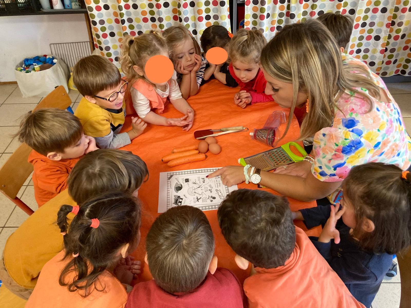 Le matin, les enfants sont arrivés à l’école avec un vêtement ou un accessoire orange. Une fois en classe, nous avons cuisiné un carotte-cake. Surprenant de mettre un légume dans un gâteau !!