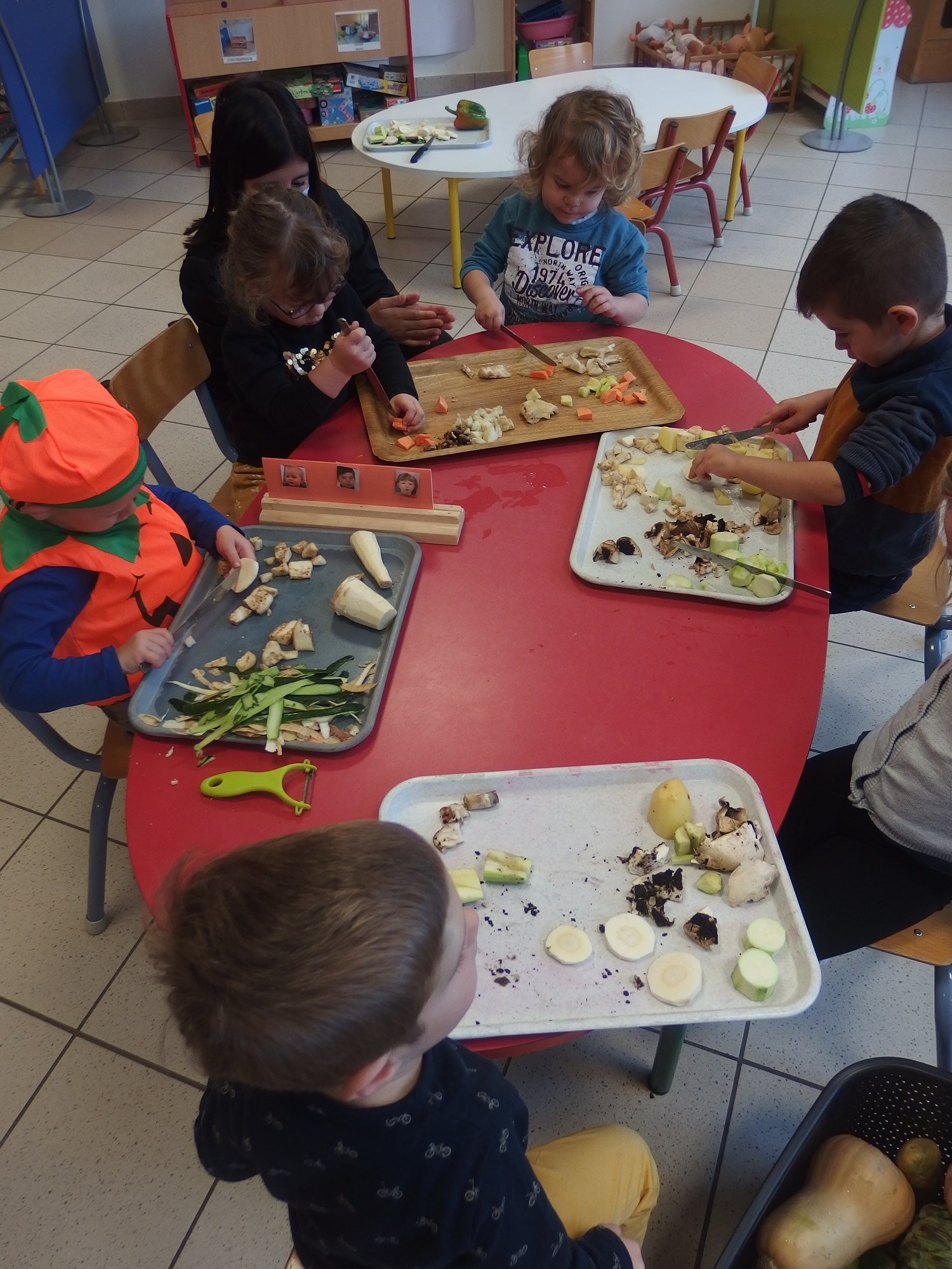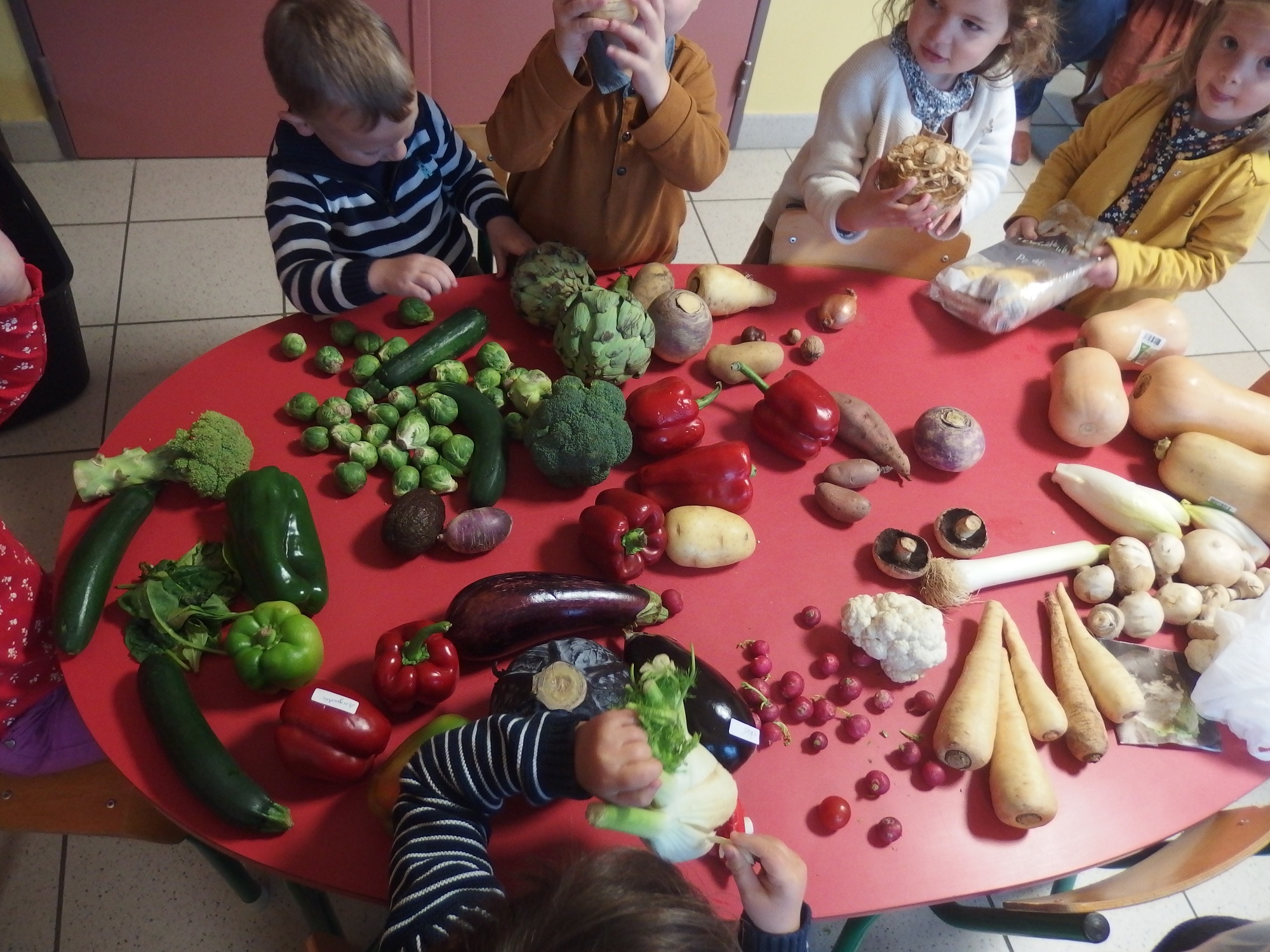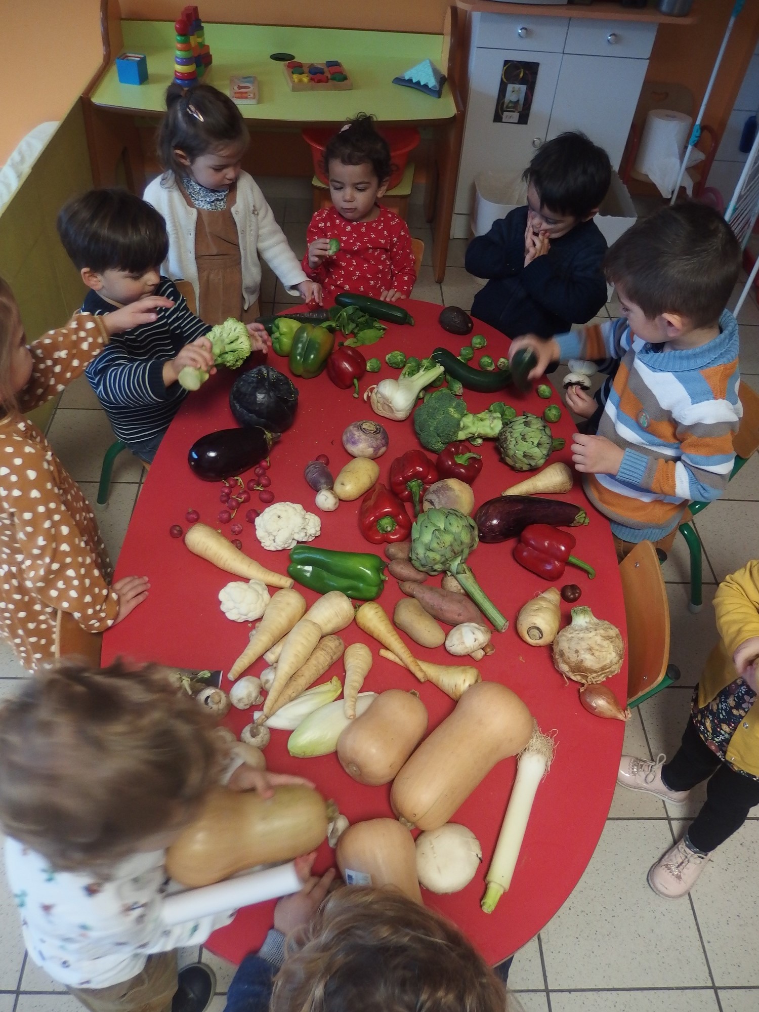 Chaque jour un légume d’une couleur différente apporté par les enfants. Dégustation, confection d’une délicieuse soupe et d’un gâteau aux carottes…L’occasion d’inciter les enfants à manger des légumes !