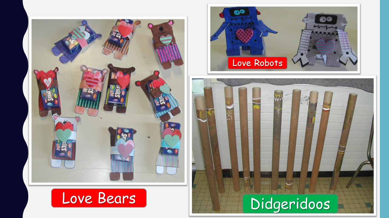 Il y avait deux activités créatives.  D’abord, les enfants ont décoré les didgeridoos, préparés la semaine dernière, puis ils ont fait des « Love Bears », les petits ours avec des surprises pour la fête de St Valentin – des Smarties.