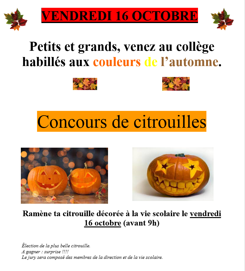 Pour ce vendredi 16/10, il est demandé à tous, petits et grands, de venir au collège habillés aux couleurs de l’Automne. Attention : le maquillage est interdit.